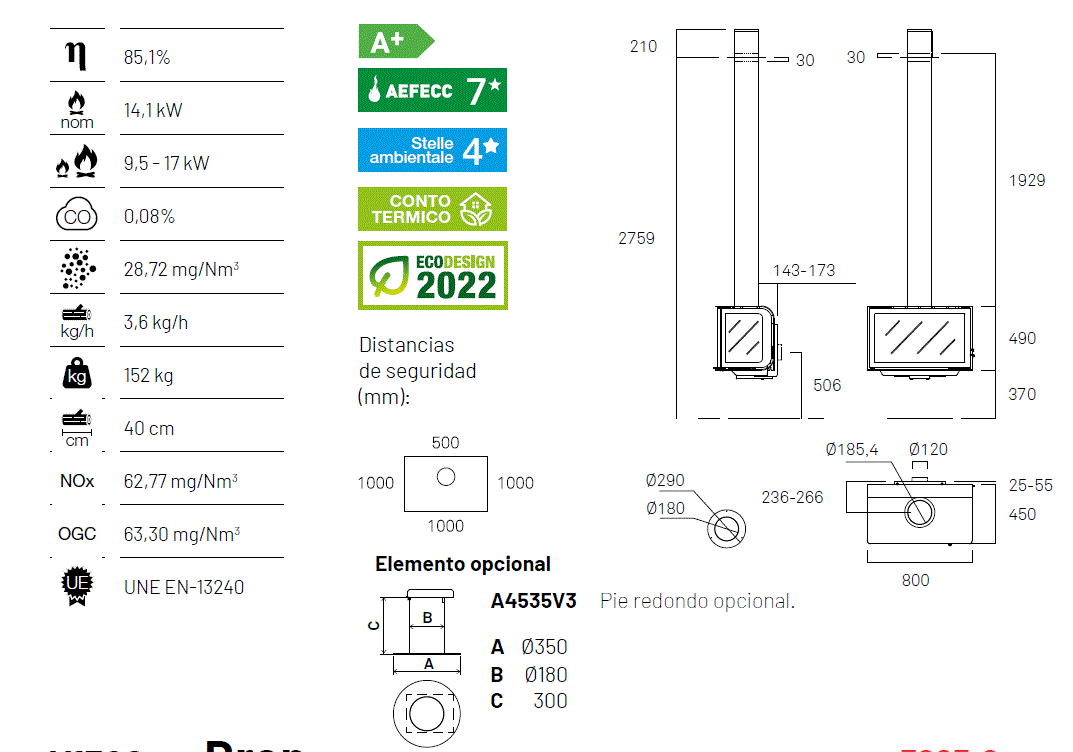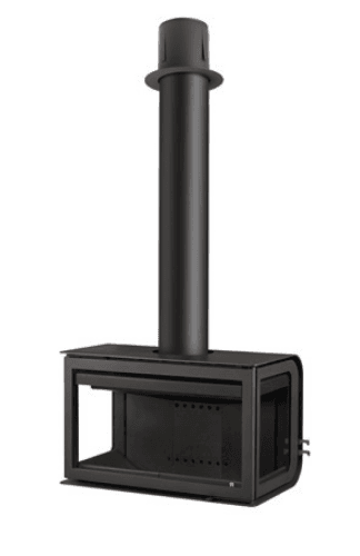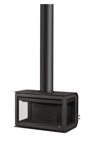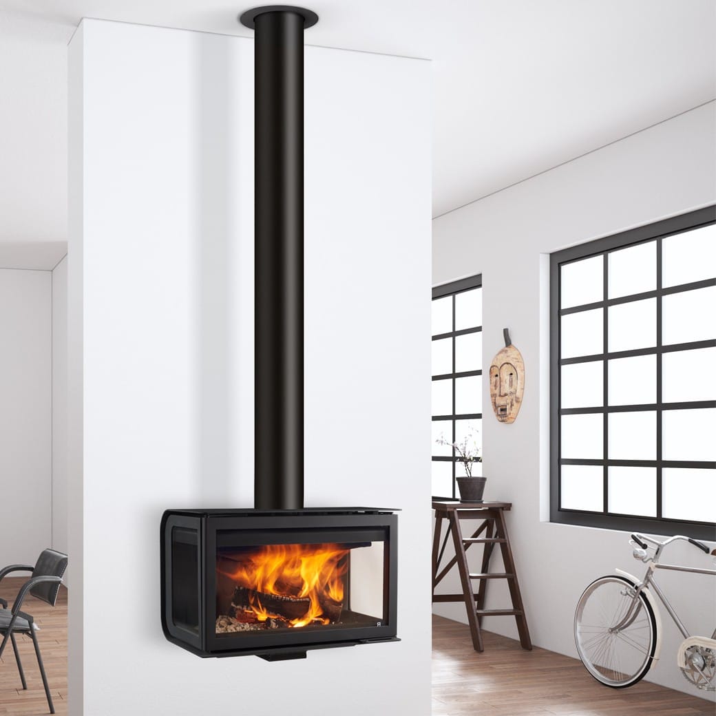 En moderne og stilren vedovn med sideglass, som gir maksimal innsikt til flammene fra flere vinkler. Perfekt som et visuelt midtpunkt i rommet – enten montert vegghengt eller pidestal