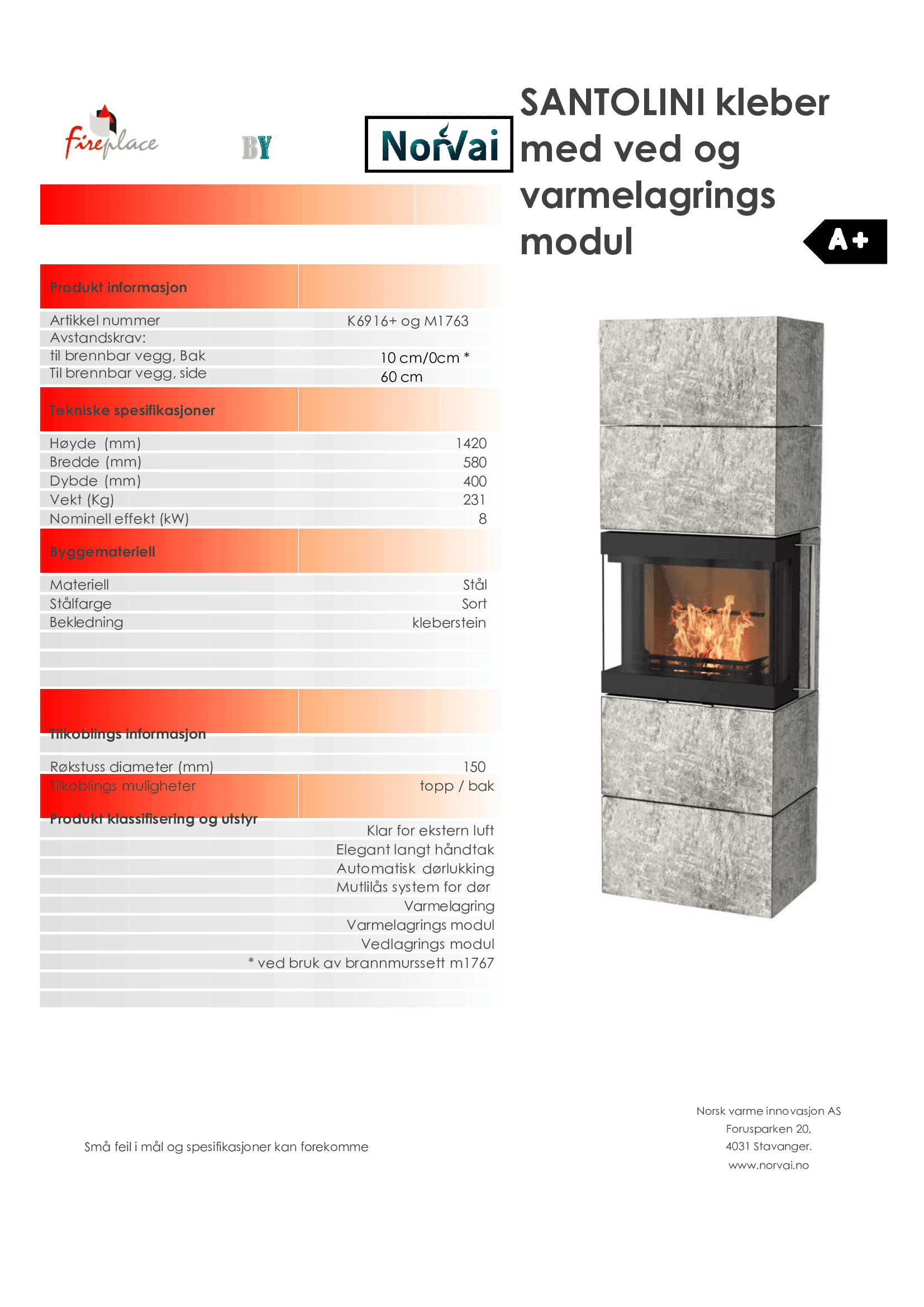 Ovnen er utstyrt med varmelagringssteiner, noe som gir en god og jevn varme etter fyring. Det følger også med en vedlagringsmodul, hvor du kan lagre veden.